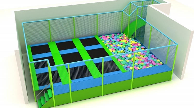 Батутная арена включает в себя: батутные секции для прыжков, расположенные горизонтально и под углом и поролоновую яму. Количество и расположение батутных секций, а также цветовое решение можно изменить в соответствии с площадью конкретного помещения и задачами клиента. Нижняя часть батутной арены может быть затянута баннерным полотном или сеткой с цветной печатью на выбор.