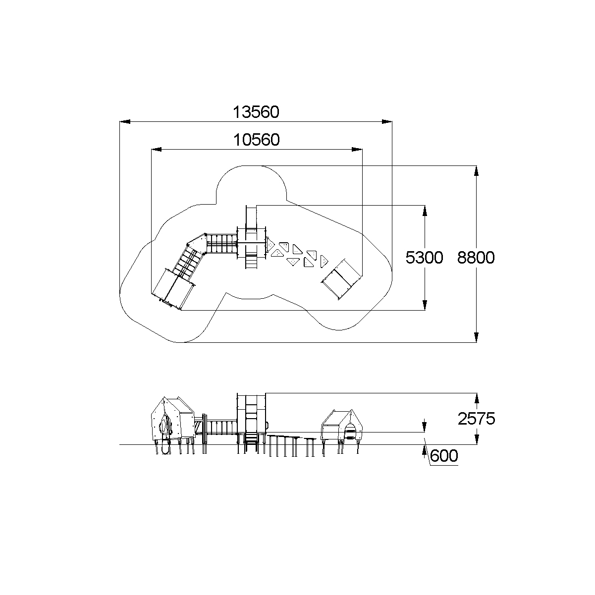 Детский игровой комплекс должен представлять собой модульную сборно-разборную конструкцию и состоять из трех домиков и одной треугольной башни. Домики и башня должны быть соединены между собой двумя веревочными мостами и переходом переправой. К домику 1, с двускатной крышей, с высотой площадки не менее 600 мм, должны быть пристроены:боковые и передние стенки, гибкая лестница. Отверстия в форме геометрических фигур должны служить входом и окошками домика. К треугольной башне, с высотой площадки не менее 600 мм, должно быть пристроено фанерное ограждение. К домику 2, с двускатной крышей, с высотой площадки не менее 600 мм, должны быть пристроены:боковые и передние стенки, перегородки, горка, лестница. К домику 3, с двускатной крышей, с высотой площадки не менее 600 мм, должны быть пристроены:боковые и передние стенки с арочным входом, счеты, перекладины. Несущие столбы комплекса должны быть выполнены из клееного деревянного бруса сечением не менее 100х100 мм и иметь скругленный профиль с канавкой посередине. Сверху открытый столб должен заканчиваться пластиковой заглушкой, снизу столб должен заканчиваться металлическим оцинкованным подпятником диаметром не менее 42 мм, который бетонируется в землю. Пол башни и домиков должен быть изготовлен из влагостойкой ламинированной нескользящей фанеры толщиной не менее 21 мм. Горка должна состоять из ската, бортиков, защитной секции и защитной перекладины. Горка должна иметь стартовый участок высотой не менее 600 мм, участок скольжения и конечный участок. Скат должен быть изготовлен из единого листа нержавеющей стали толщиной 1,5 мм, утопленный в паз бортиков горки. Бортики горки, выполненные из влагостойкой фанеры толщиной не менее 21 мм должны быть высотой не менее 100 мм. Защитная перекладина должна быть выполнена из металлической трубы диаметром не менее 33 мм, побуждающая ребенка присесть и установлена на высоте не менее 600 мм от уровня поверхности стартового участка горки. Перегородки домика должны выполнять роль защитной секции. Переход в виде переправы должен быть выполнен из ступенек из ламинированной нескользящей фанеры толщиной 21 мм, установленных на опорных металлических стойках диаметром не менее 42 мм, которые бетонируются в землю. Веревочный мост должен представлять собой конструкцию из полипропиленового каната диаметром не менее 16 мм. Каната должен крепится к металлической трубе прямоугольного сечения 60х30мм. Лестница высотой не менее 600 мм должна быть оснащена перилами с отверстиями для рук, выполненные из влагостойкой фанеры толщиной не менее 21 мм. Роль перил должны выполнять перегородки домика. Ступени лестниц должны быть выполнены из ламинированной противоскользящей влагостойкой фанеры толщиной не менее 21 мм. Расстояние между ступенями должно быть одинаковым. Гибкая лестница должна состоять из полипропиленового каната диаметром не менее 16 мм и пластиковой ступеньки.