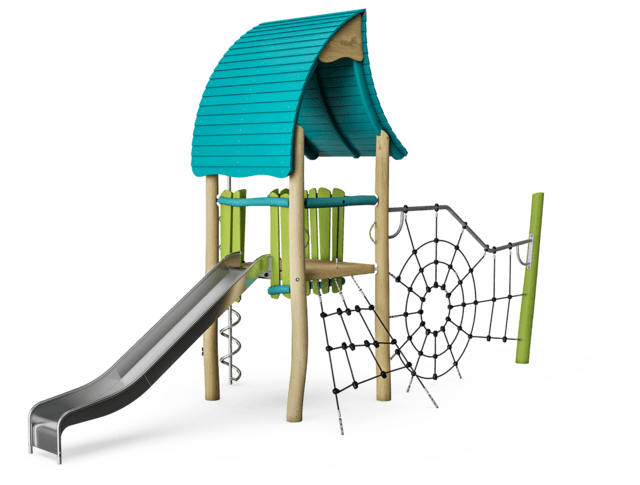 Домик паука - это выдающаяся вещь, которая приглашает детей прийти и поиграть. Детей невероятно привлекают его сложные игровые задачи, и они будут возвращаться сюда снова и снова. Наклонная сеть для скалолазания обеспечивает сложный, но управляемый доступ к платформе. Хорошие поручни поддерживают вход на платформу. Отсюда три выхода. Скольжение и вращение, помимо того, что это очень весело, тренируют чувство равновесия и пространственное осознание, а также мышцы ног и туловища. Сеть пауков - это покачивающаяся точка для встреч, а также фантастический тренажер на координацию. Ползание по большим сетям, горизонтальным или наклонным ступенькам тренирует перекрестное модальное восприятие, что важно, например, для навыки чтения.