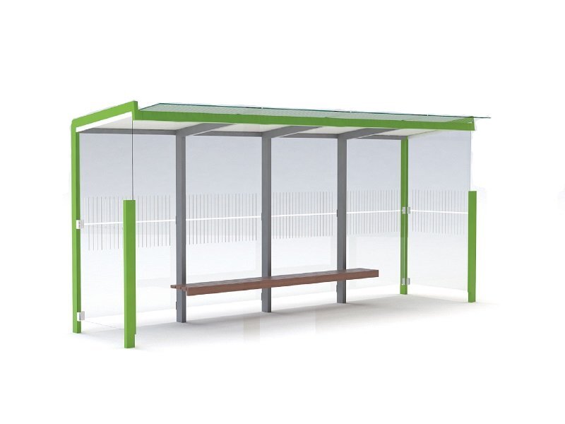 Серия навесов Geomere с оптимизированным решением функциональных компонентов. Простая и эффективная модульная система с опорами в задней стенке. Это позволяет создавать конструкции без боковых стенок, что особенно удобно для применения в узком пространстве. Интегрированная элегантная скамья с деревянными ламелями гармонично дополняет комплект. Интересным является графическое решение стеклянных панелей на крыше и стенках.
