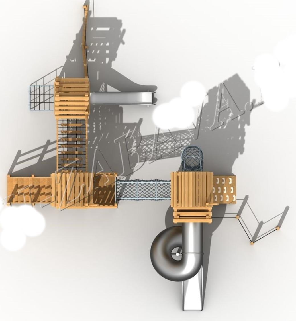- Материалы: древесина БАДИ, канат φ16мм, листовой ПНД, нержавеющая сталь, оцинкованная труба