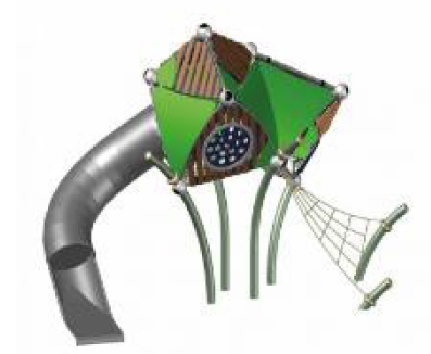Каркас комплекса выполнен из нержавеющих шлифованных труб диаметром 57х3 мм, марка стали AISI 304. Канатная часть комплекса выполнена из каната армированного шестипрядного диаметром 16 мм, состоящего из полипропиленовых нитей и стальной проволоки. Соединители для каната типа «клевер» выполнены из нержавеющей стали диаметром 9 мм. Боковые панели комплекса комбинированные, задняя часть панелей и оконные вставки выполнены из HDPE-пластика толщиной 15 мм, наружная часть панелей выполнена из HPL толщиной 15 мм. Каркас комплекса собран в единую структуру при помощи литых полусфер из алюминия с защитным полимерным покрытием. Отверстия в полусферах закрыты крышками из стали с полимерным покрытием. Крепления для листового HDPE и HPL к трубе круглого сечения 57 мм и крепления для каната диаметром 16 мм к трубе круглого сечения 57 мм выполнены из стеклонаполненного полиамида. ната диаметром 16 мм к трубе круглого сечения 57 мм выполнены из стеклонаполненного полиамида. Горки желоб тоннельный выполнены из нержавеющей стали.
