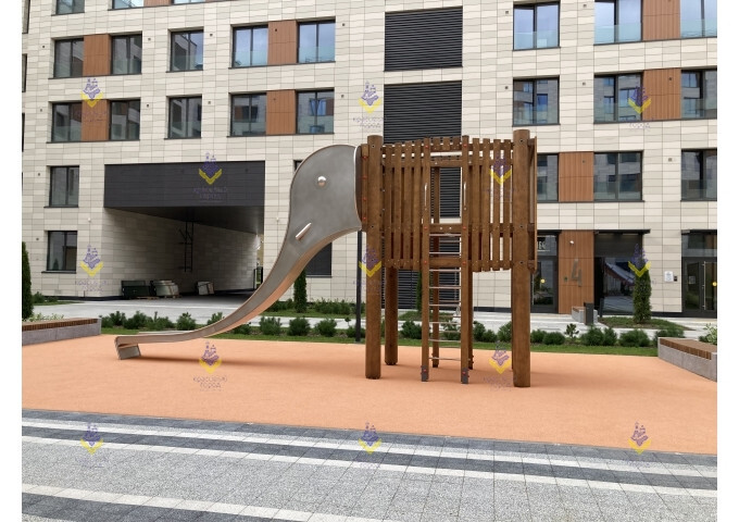 Горка декорирована в виде мордочки слона, где в качестве хобота выступает спуск. Сама детская площадка оформлена в эко-стиле. Она станет украшением любого двора или парка.