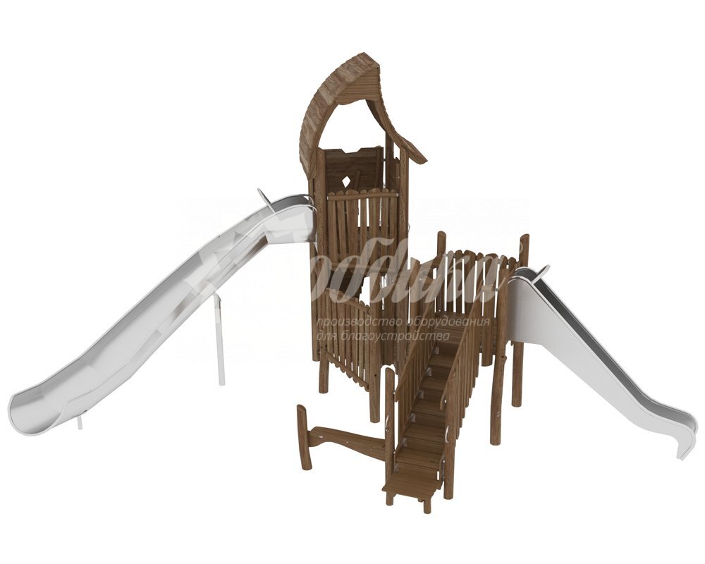 Деревянные конструкции: Бревна робинии. Погонажные изделия – клееный брус из лиственницы. Покрытие – деревозащитный декоративный глубокопроникающий состав на алкидной основе. Возможность выбора цвета или сочетания цветов под заказ. Стандартные цвета: Орех, Махагон, Орегон.Горка, поручни, перекладины: Прямые горки h1200 мм и h2000 мм. Нержавеющая сталь AISI 304.
