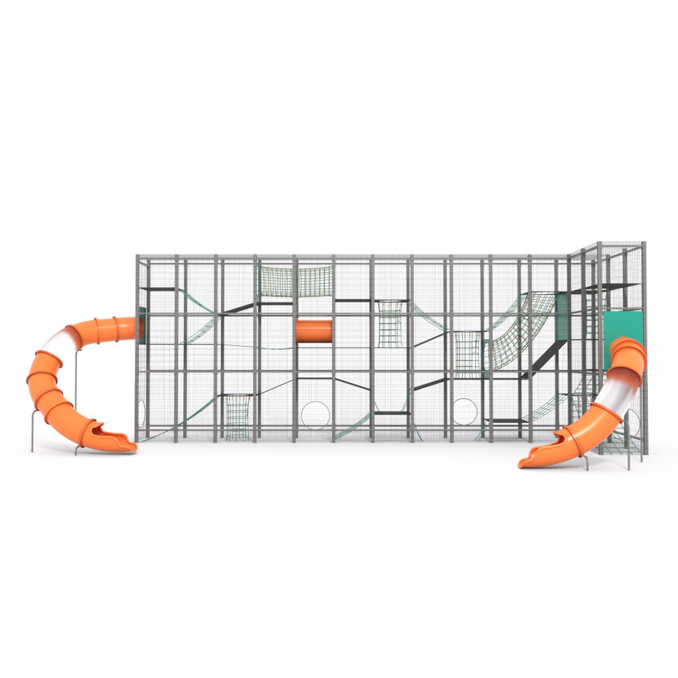 Несущий каркас комплекса выполнен из металлических труб сечением 100х100 и 100х50 мм с защитным порошковым покрытием. По периметру каркас закрыт защитной металлической оцинкованной сеткой с размером клетки 50х200 мм. Полы и вертикальные перегородки выполнены из HDPE пластика толщиной не менее 15 мм. Канатные части выполнены из полипропиленового армированного 6-прядного каната Ø16 мм, х-образные и т- образные соединения канатов выполнены из полиамида (ПА6). Туннельные горки выполнены из пластика (LLDPE) с толщиной стенки 5 мм.