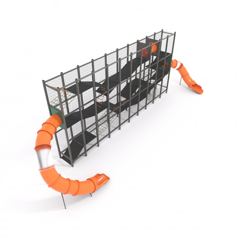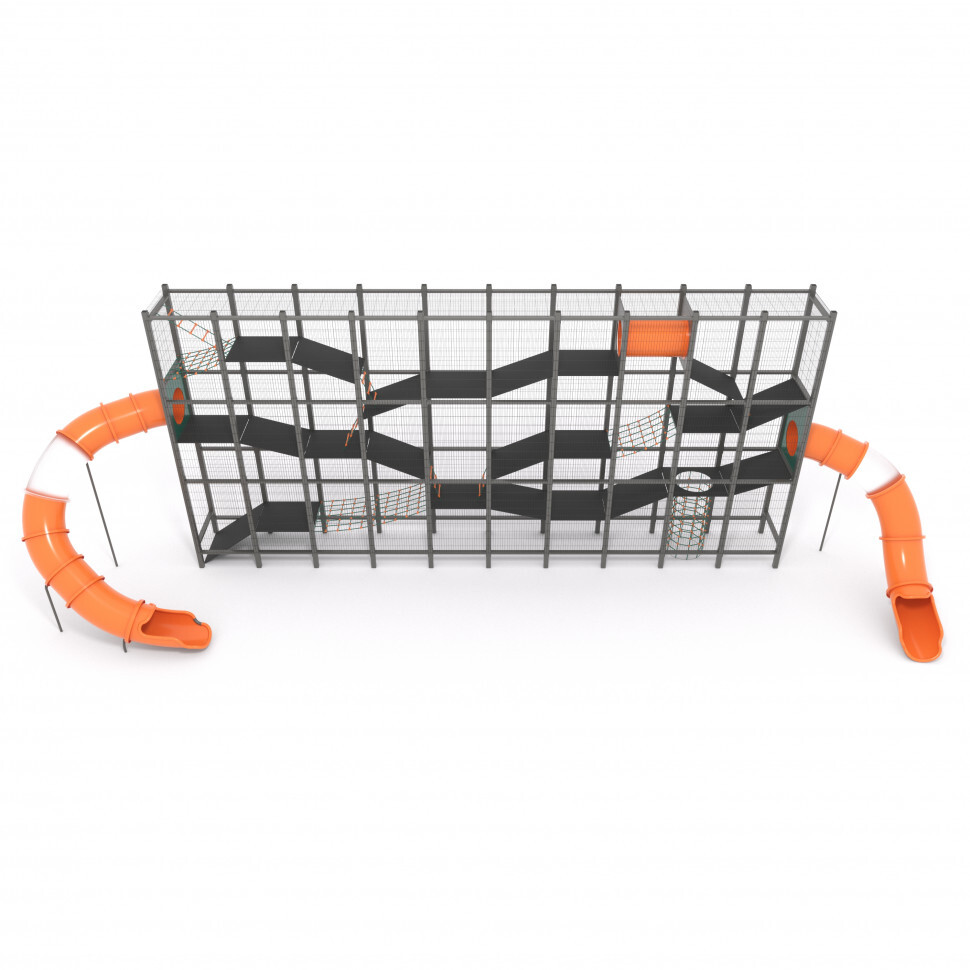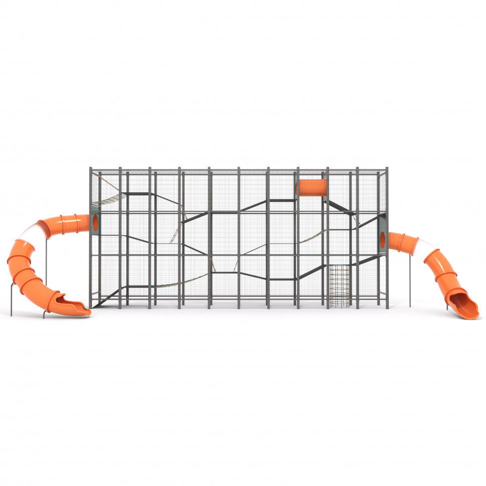 Несущий каркас комплекса выполнен из металлических труб сечением 100х100 и 100х50 мм с защитным порошковым покрытием. По периметру каркас закрыт защитной металлической оцинкованной сеткой с размером клетки 50х200 мм. Полы и вертикальные перегородки выполнены из HDPE пластика толщиной не менее 15 мм. Канатные части выполнены из полипропиленового армированного 6-прядного каната Ø16 мм, х-образные и т- образные соединения канатов выполнены из полиамида (ПА6). Туннельные горки и переходы выполнены из пластика (LLDPE) с толщиной стенки 5 мм .