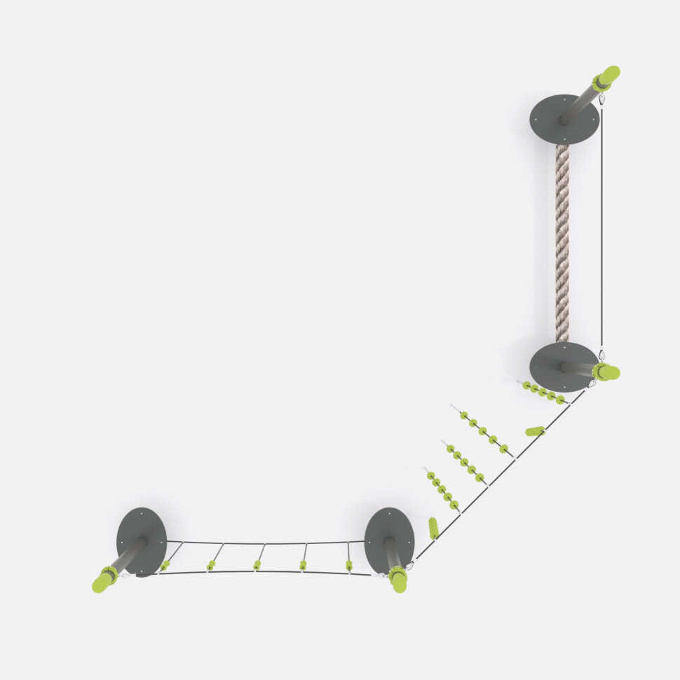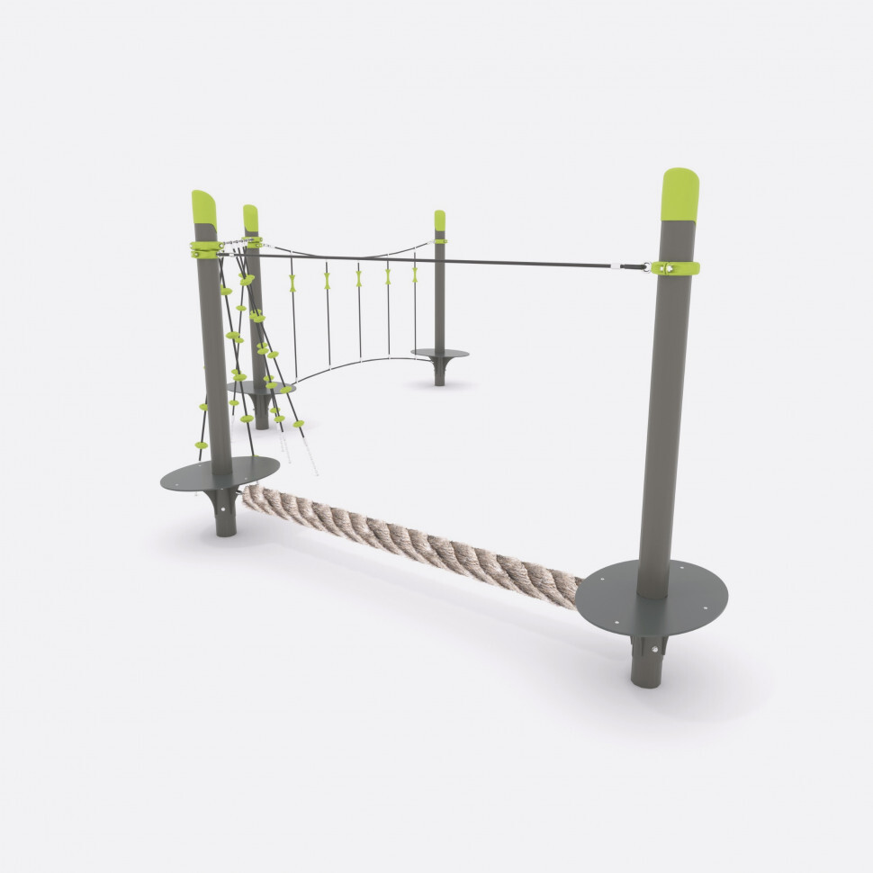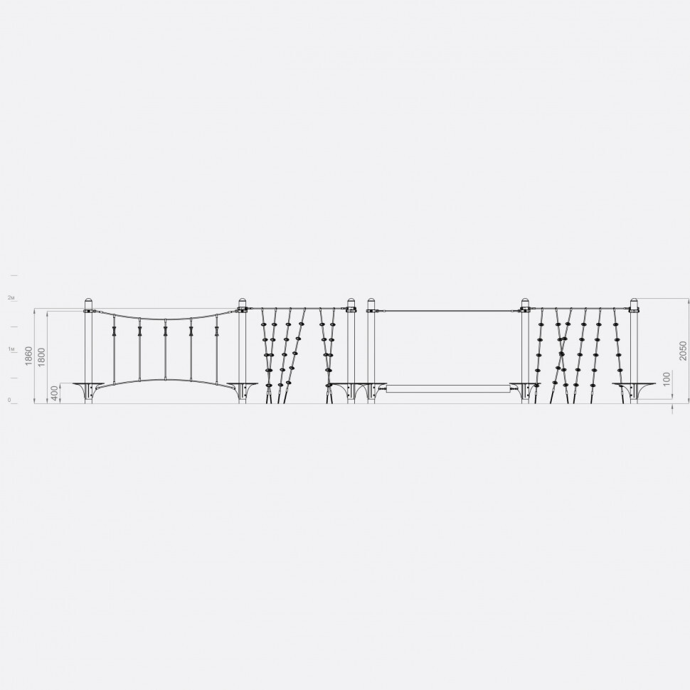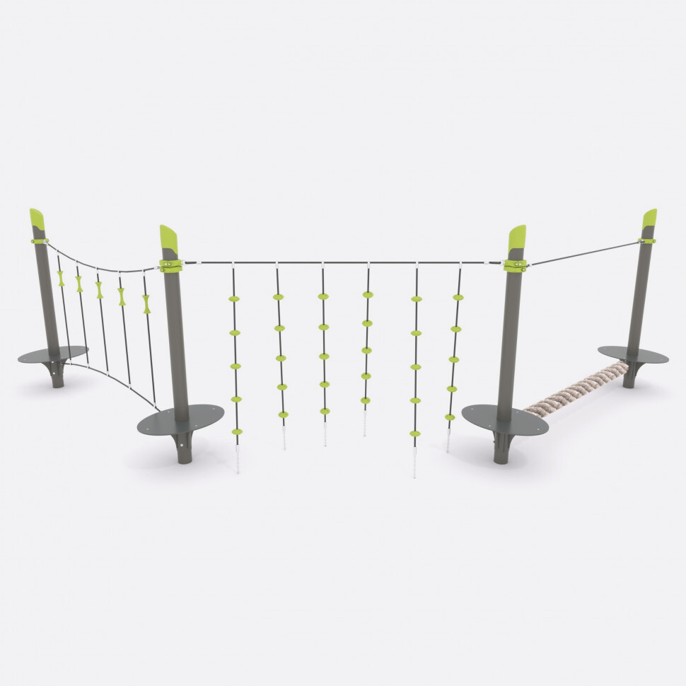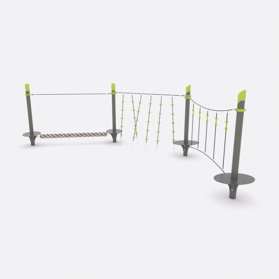 Состоит из трех блоков: 1-й – канатный рукоход, 2-й – переход с канатами-лазалками, 3-й – переход по толстому канату «Викинг». 1-й блок представляет собой два армированных каната, расположенных параллельно друг другу, между ними вертикально натянуты 5 канатов с ручками. 2-й блок – к верхнему канату, расположенному параллельно земле, крепятся канаты с пластиковыми уступами для лазания. 3-й блок состоит из двух армированных канатов различной толщины.