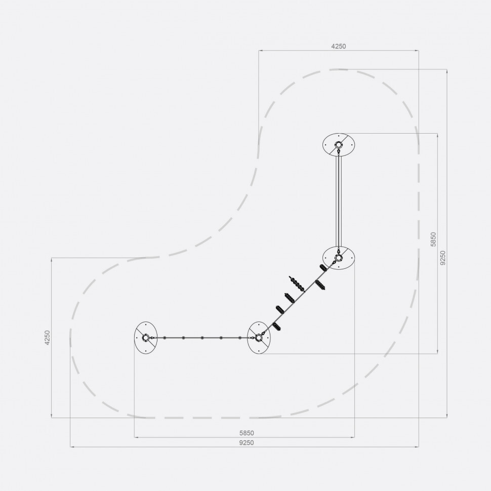 Каркас комплекса образуют опорные трубы-стойки, к которым с помощью стальных хомутов крепятся канаты. Торцы столбов закрываются защитными заглушками.
