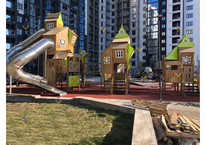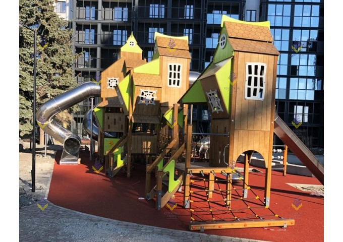 Игровой комплекс «Небесное дерево» тип-1 с канатным переходом и качающимся мостиком между башнями предназначен для активных игр детей в возрасте от 6-ти до 12-ти лет. Детская площадка имеет две высокие горки туннельного типа – 3200 и 4500 мм. Также имеется открытая горка высотой 2000 мм. Внизу комплекса установлены различные обучающие и развивающие панели, что делает площадку еще более универсальной.