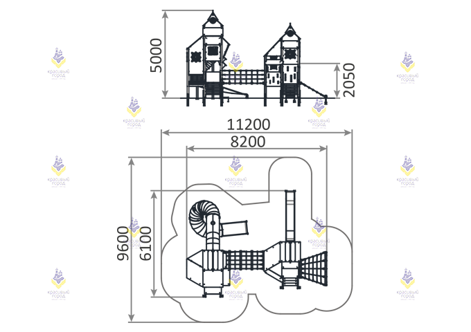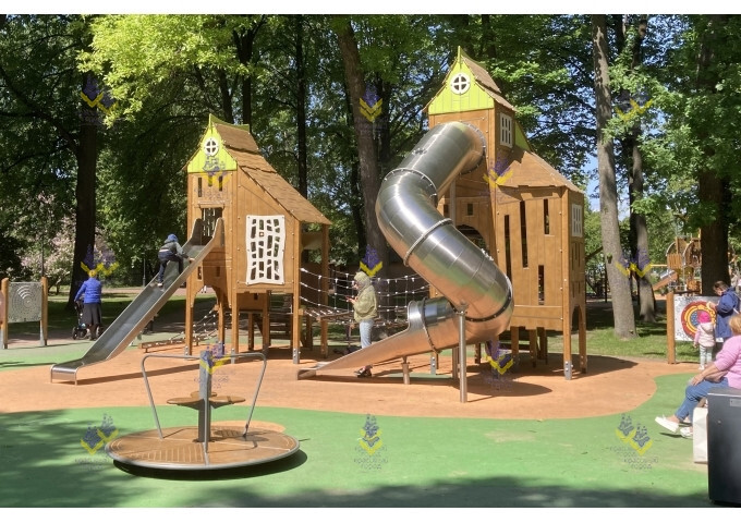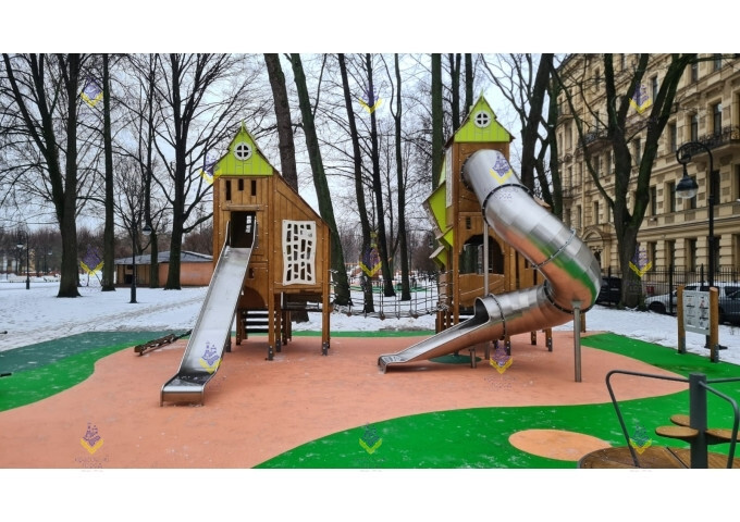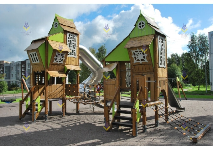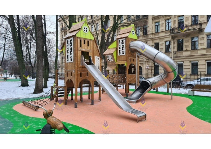 Игровой комплекс из серии «Небесное дерево» тип-3 включает в себя две башни, прямую и винтовую горку из нержавеющей стали, веревочную сетку для подъема и канатный мостик для перехода между башнями. Закрытые башни-домики станут удобным местом для игр, даже в плохую погоду. Здесь каждый ребенок сможет найти что-то интересное для себя.