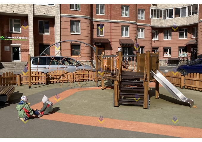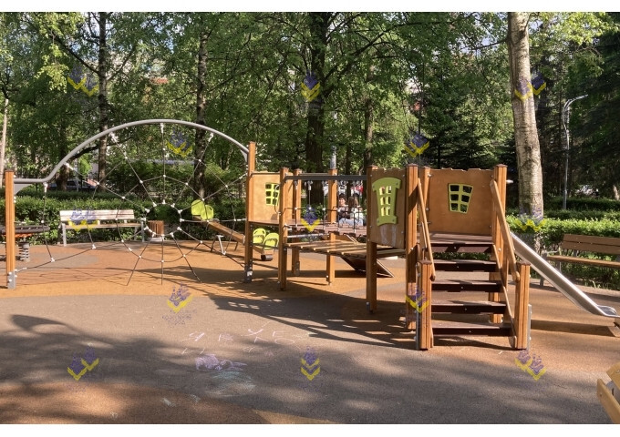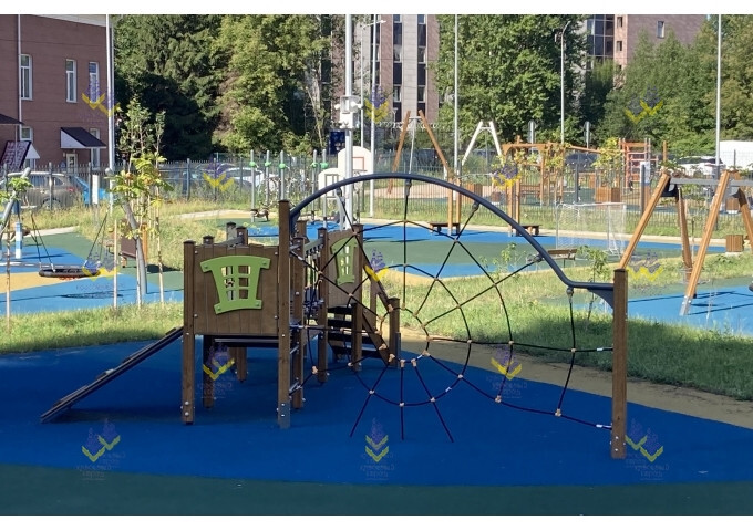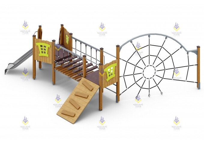 Игровой комплекс «Паутина» привлекает свои необычным оформлением. Центральный элемент –сетка для лазания, выполненная в виде паутины. Сетка изготовлена из шестипрядного армированного каната, который выдерживает нагрузку до 3300 кг! Также для активных игр имеется подвижный мостик и небольшая металлическая горка.