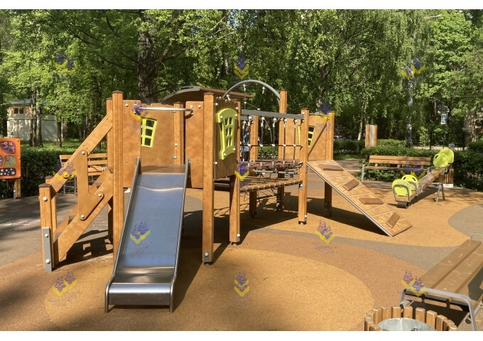 Такая детская площадка подойдет для детей от 5-ти лет. Здесь будет интересно играть как в одиночку, так и компанией. Дети смогут весело провести время на свежем воздухе и пообщаться со сверстниками. Активные игры способствуют и физическому развитию ребенка. Все элементы комплекса безопасны и выполнены из качественных материалов, рассчитанных на высокие нагрузки.