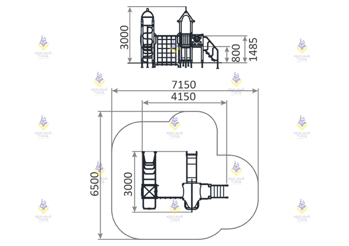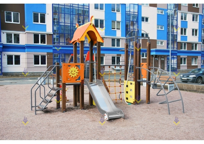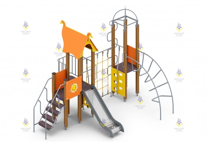 Оборудование предназначено для малышей от 4-х лет. Сюда входит небольшая горка (h-900), на которую можно подняться по обычной лестнице с перилами или же по канату, веревочная сетка и различные гимнастические элементы. Это хорошее решение для детских игровых и спортивных площадок во дворах, детских садах, парках.