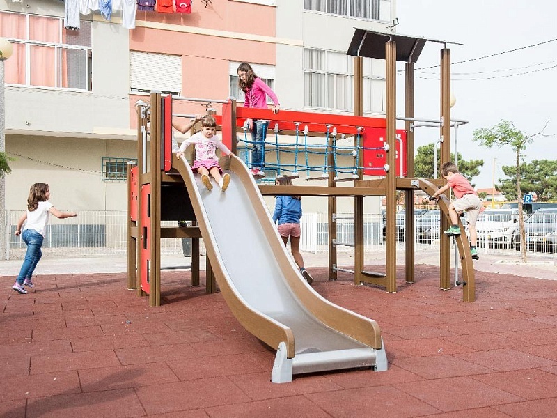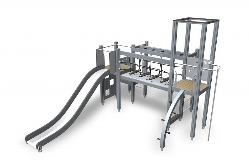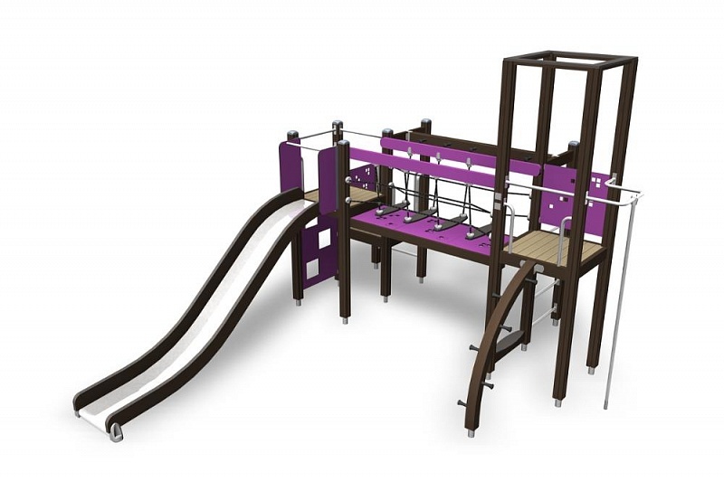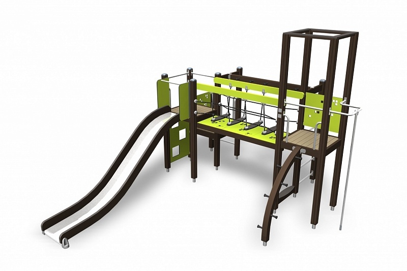 Многофункциональный игровой комплекс для детской площадки «Солнечная башня» оснащен горкой, подвесным мостом и другими игровыми элементами.