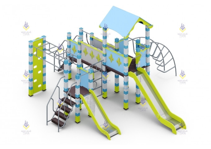 Игровой комплекс «Спортивный городок» тип-2 разработан для детей в возрасте от 7 до 12 лет. Здесь дети смогут не только играть, но и заниматься спортом, весело и активно проводить время с друзьями. Детская площадка включает в себя крытую башню с площадкой для игр, две горки из нержавеющей стали, рукоход, стену с выступами и всевозможные элементы для лазания.