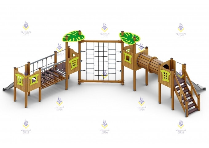 Игровой комплекс «Тропики» представляет собой небольшую полосу препятствий. Здесь ребенок сможет представить себя отважным охотником, мореплавателем, оказавшимся на необитаемом острове или путешественником, пробирающимся сквозь непролазные джунгли. Детская площадка включает в себя две горки из нержавеющей стали с лестницами, качающийся мостик, трубу для лазания и веревочный комплекс. Все элементы прочные, безопасные и способны выдержать самые активные детские игры. Оборудование подходит для установки на территории двора, школы, парка, загородного клуба, торгового центра.