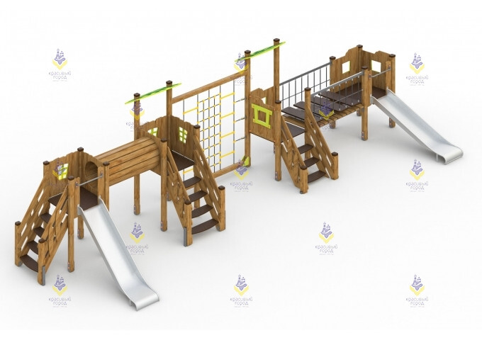 В составе комплекса есть множество частей. Кроме классической горки и лесенки, это подвесной мост, туннель, канатное полотно. Таким образом дети могут карабкаться, взбираться по мосту и весело проводить время.