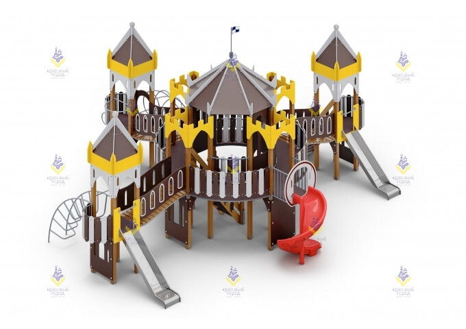 Большой игровой комплекс со сказочным названием - «Замок людоеда» создан для детишек в возрасте от 7 до 12 лет. Детская площадка включает в себя целых три горки. Две из них выполнены из нержавеющей стали и имеют прямой спуск, третья – винтовая. Также в числе развлекательных элементов – лестницы, рукоходы, мостики. Отдельного внимания заслуживает оформление. Здесь дети смогут ощутить себя словно в настоящем замке!