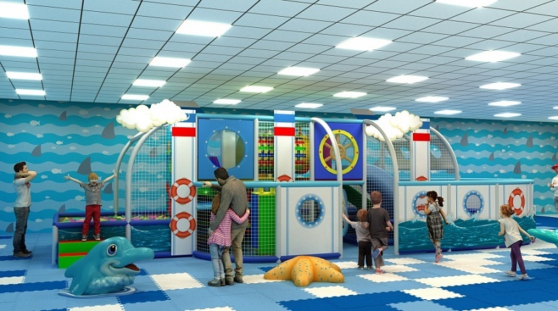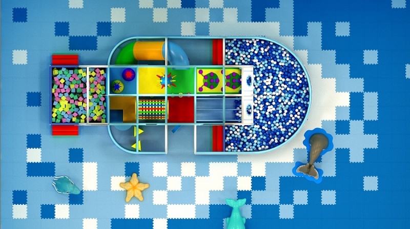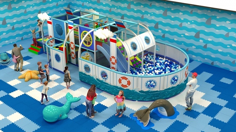 Второй этаж лабиринта снабжен мягкими препятствиями в морской теме В морской стилистике оформлены и МАФы, которые представляют собой отдельные игровые элементы.