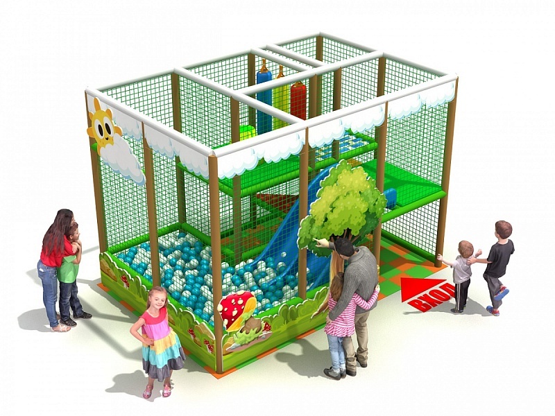 Детский игровой лабиринт с красочными декорациями занимает площадь 9,5 кв.м и оформлен в тематике летней полянки.