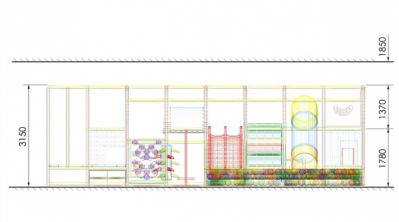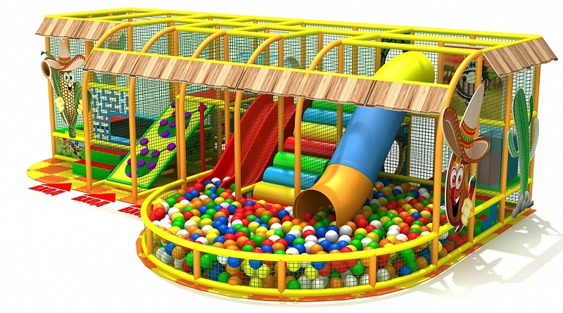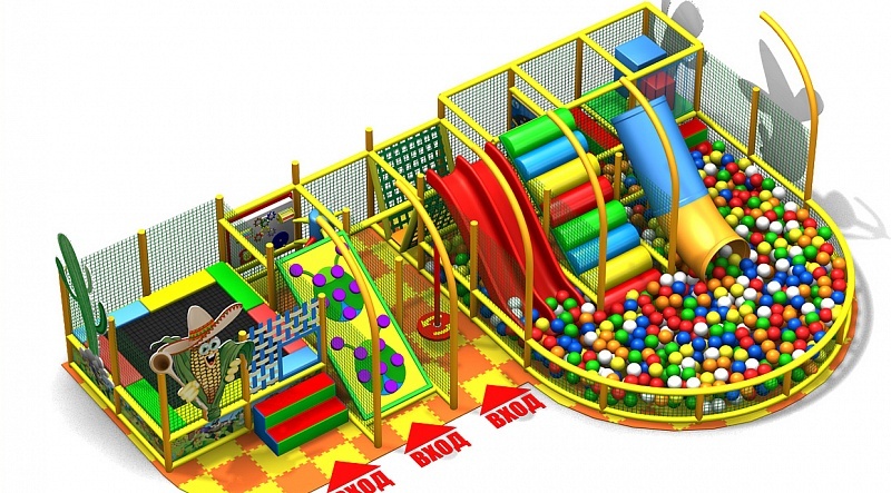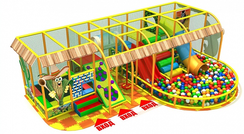 Проект лабиринта включает разнообразные игровые элементы: двускатные горки, сухой бассейн с с шариками и подъем в виде бревнышек. Также игровое пространство комплекса дополняют такие элементы, как подвесные груши, вращающиеся валики, репсовые тоннели, мостики.