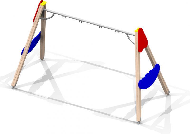 Качели двухсекционные должны представлять собой устойчивую конструкцию, состоящую из 4-х несущих столбов, балки, 2-х угловых накладок и 2-х декоративных элементов в виде листвы дерева. Несущие столбы должны быть выполнены из клееного деревянного бруса сечением не менее 100х100 мм и иметь скругленный профиль с канавкой посередине. Сверху столб должен заканчиваться пластиковой заглушкой, снизу столб должен заканчиваться металлическим оцинкованным подпятником диаметром не менее 42 мм, который бетонируется в землю. Балка должна быть выполнена из оцинкованной металлической трубы диаметром не менее 60 мм с креплениями для двух подвесок, ребра жесткости из трубы диаметром 42мм. Угловые верхние накладные и нижние декоративные элементы должны быть выполнены из влагостойкой фанеры толщиной не менее 21 мм.