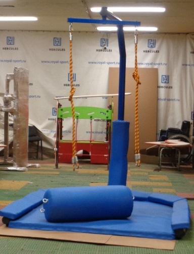 Материалы - стальная труба диам. 76, 60, 40х25, пруток диам.40, 20, труба ПВХ 200мм. Стальной Лист 5мм .Мягкие детали толщиной 50мм пенополиуретан, искожа.Шарнир - подшипники качения, упорный, радиальныйКрепление сидения-валика - комбинированный канат, оцинкованные коуши, алюминиевые втулки зажатые на специальном прессе. Регулировка высоты расположение сидения-валик не предусмотрена.Габариты