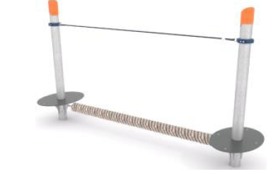 Стойки из 108 мм оцинкованных труб с порошковым покрытием (муар), канат армированный 6-прядный диаметром 16 мм, канат армированный 4-прядный 140х140 мм, заглушки на торцах труб из полиамида ПА6, хомуты из стеклонаполненного полиамида, площадки на стойках из HDPE пластика с резиновым, антискользящим слоем.