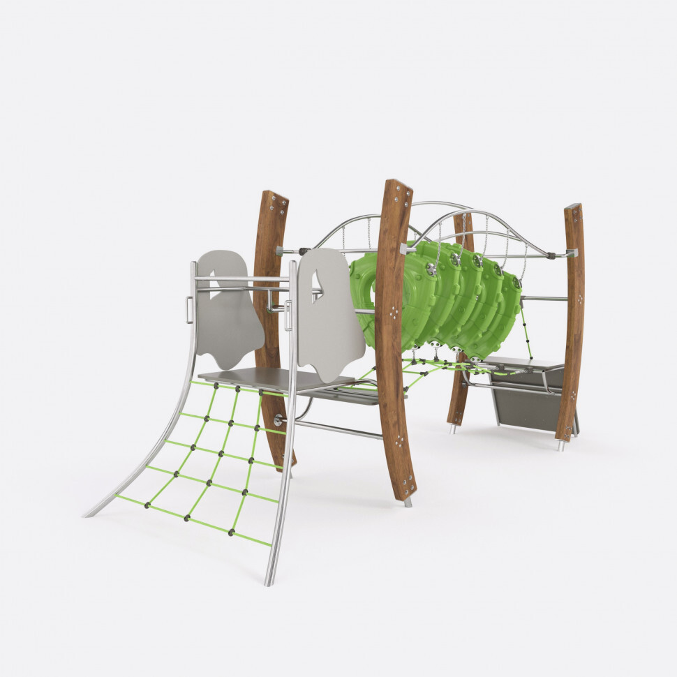Игровая канатная конструкция для детских площадок. Представляет собой конструкцию в форме слона из гнутоклеенного лиственного бруса. Канатная часть игрового комплекса изготавливается из армированного шестипрядного каната диаметром 16 мм. Х-образные соединения каната цельнолитые, выполнены из полиамида (ПА6), обжимные гильзы из алюминиевого сплава. Конструкция имеет различные игровые элементы: металлические перекладины, наклонную канатную сетку, серию кольцевых подвесов для лазания, платформы из панелей из HDPE-пластика толщиной 15 мм с прорезиненной поверхностью и стропа с пластиковыми уступами.