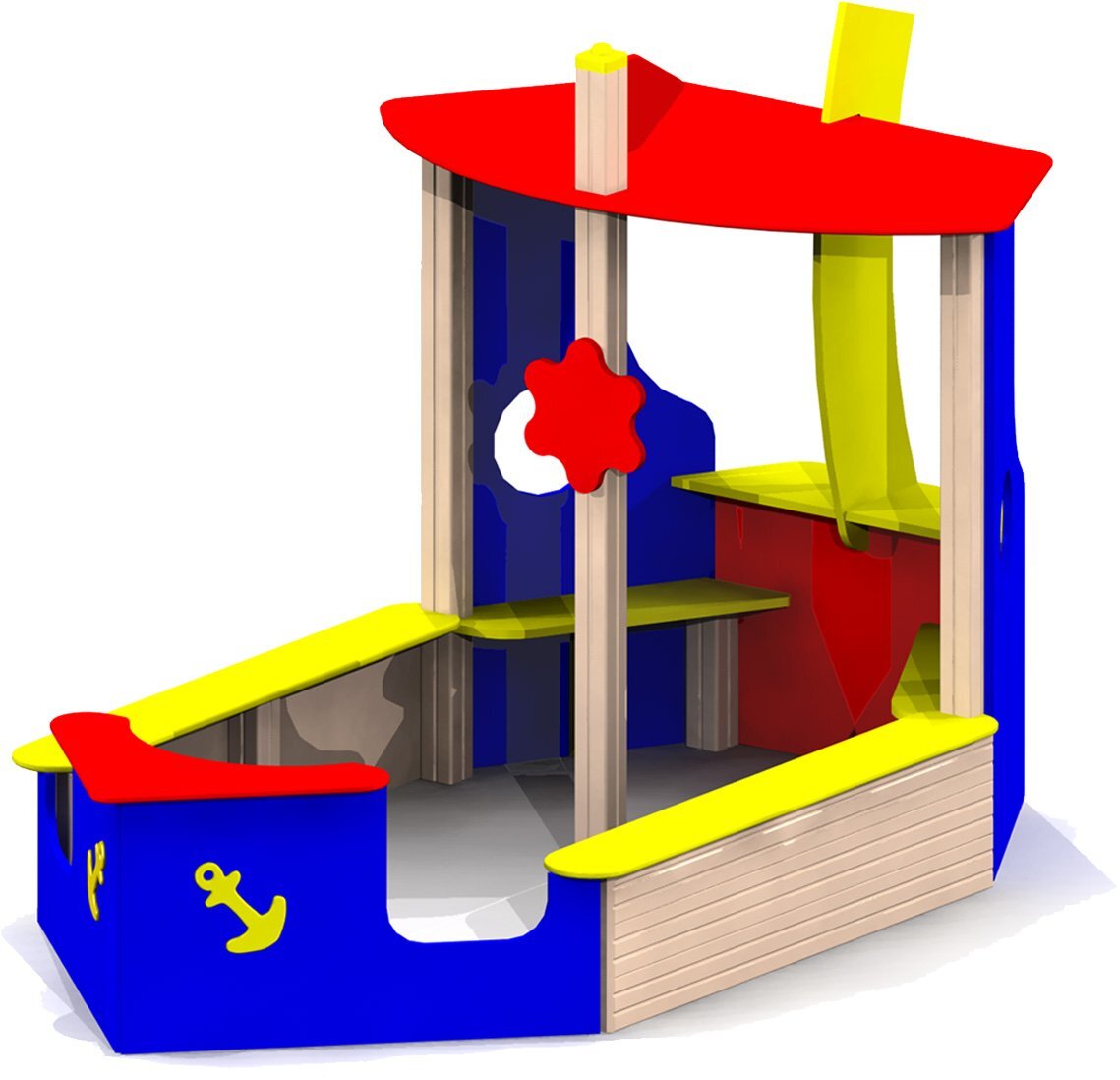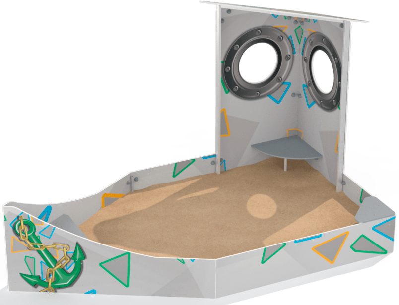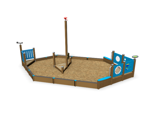 Песочница должна представлять собой устойчивую, модульную конструкцию из игровых и развивающих элементов, обеспечивающие ребенку комфортные условия для игры с песком на открытом воздухе. Конструкция песочницы должна быть стилизована в виде «Кораблика». Песочница должна включать в себя несущие столбы, борта, угловые стенки, при соединении образующие нос корабля, скамейки, расположенные поверх бортов и возле боковых стенок, боковые стенки с круглым отверстием, установленные между бортами и задней стенкой, крышу, усиливающий элемент, столик, установленный поверх задней стенки и декоративные элементы. Между столиком и крышей должен быть установлен усиливающий элемент в виде паруса. Несущие разновысокие столбы комплекса должны быть выполнены из клееного деревянного бруса сечением не менее 100х100 мм и иметь скругленный профиль с канавкой посередине. Снизу столб должен заканчиваться металлическим оцинкованным подпятником диаметром не менее 42 мм, который бетонируется в землю. Борт должен состоять из 3-х досок толщиной не менее 40 мм, скрепленных между собой. Скамейки, крыша, усиливающий элемент, столик должны быть выполнены из влагостойкой фанеры толщиной не менее 21 мм. Декоративные элементы в морской тематике должны быть выполнены из влагостойкой фанеры толщиной не менее 9 мм.