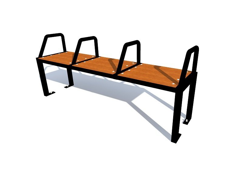 Скамья с четырьмя прочными и высокими поручнями. Изготавливается из стали с цинковым покрытием и порошковой краской. Сидение из деревянных ламелей или HPL. Требует жесткого крепления к поверхности.