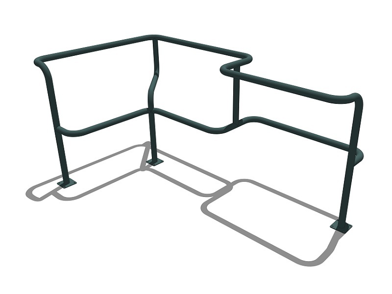 Стальная конструкция из оцинкованных труб в виде угловой скамьи с поручнями для паркура является одним из элементов серии конструкций для организации парка для паркура .