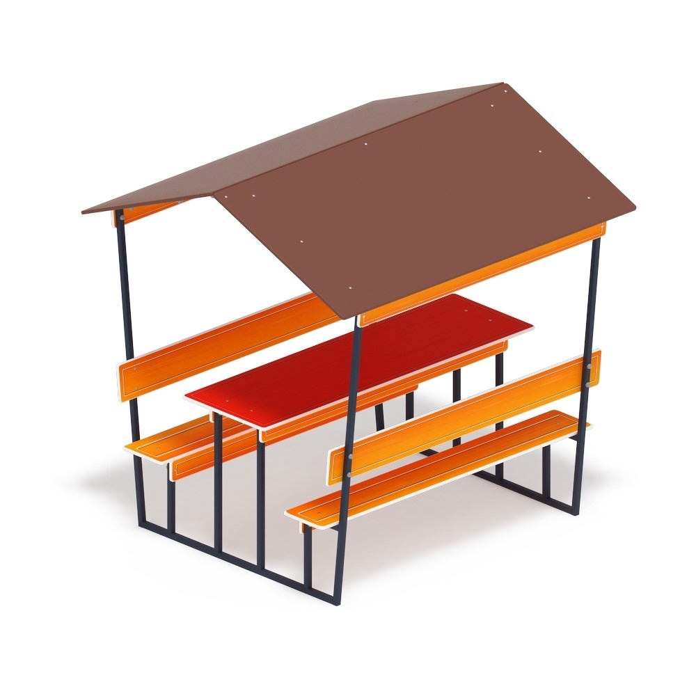 Столик взрослый с навесом МФ 32.01.05-01 - это по сути уже беседка, так как есть не только стол со скамейками, но и крыша. Этот столик отлично подойдет, когда надо будет укрыться от солнцепека или дождя.