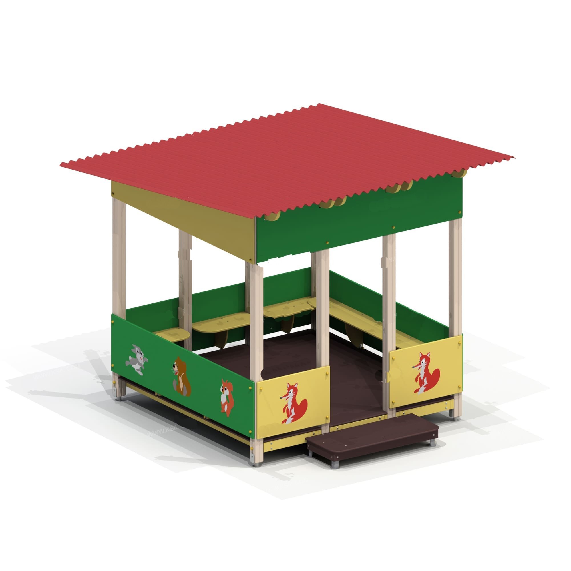 Навес должен представлять собой устойчивую конструкцию обеспечивающую защиту от воздействия солнечных лучей и атмосферных осадков. Навес должен состоять из крыши, покатую на одну сторону, скат которой покрыт влагостойкой фанерой толщиной не менее 15 мм и листами кровельного ондулина, несущих столбов, пола и боковых стен с художественной росписью золотой рыбки и декоративных элементов в морской тематике. Под кровлей должны быть установлены скамейки, расположенные вдоль боковых стенок. К главному входу должен крепиться порог. Несущие столбы должны быть выполнены из клееного деревянного бруса сечением не менее 100х100 мм и иметь скругленный профиль с канавкой посередине. Снизу столб должен заканчиваться металлическим оцинкованным подпятником диаметром не менее 42 мм, который бетонируется в землю. Пол и настил порога должен быть выполнен из противоскользящей влагостойкой фанеры толщиной не менее 21 мм. Стенки, скамейки, накладные элементы должны быть изготовлены из влагостойкой фанеры толщиной не менее 21 мм.