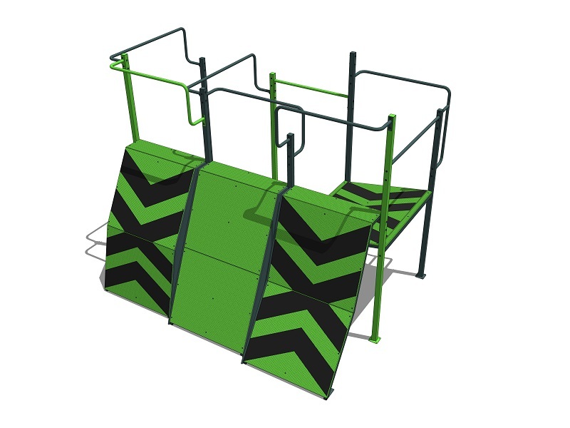 Конфигурация включает в себя наклонные доски для прыжков в нескольких конструкциях, специально сформированные горизонтальные штанги, позволяющие выполнять несколько вариантов захвата, включая выполнение флагов, подтягиваний и прыжков, наклонные платформы для тренировки равновесия.